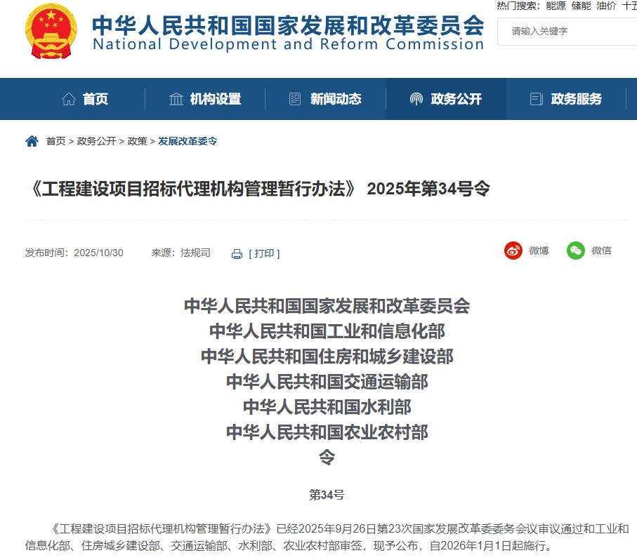 國家發(fā)展改革委公布《工程建設(shè)項(xiàng)目招標(biāo)代理機(jī)構(gòu)管理暫行辦法》2025年第34號(hào)令